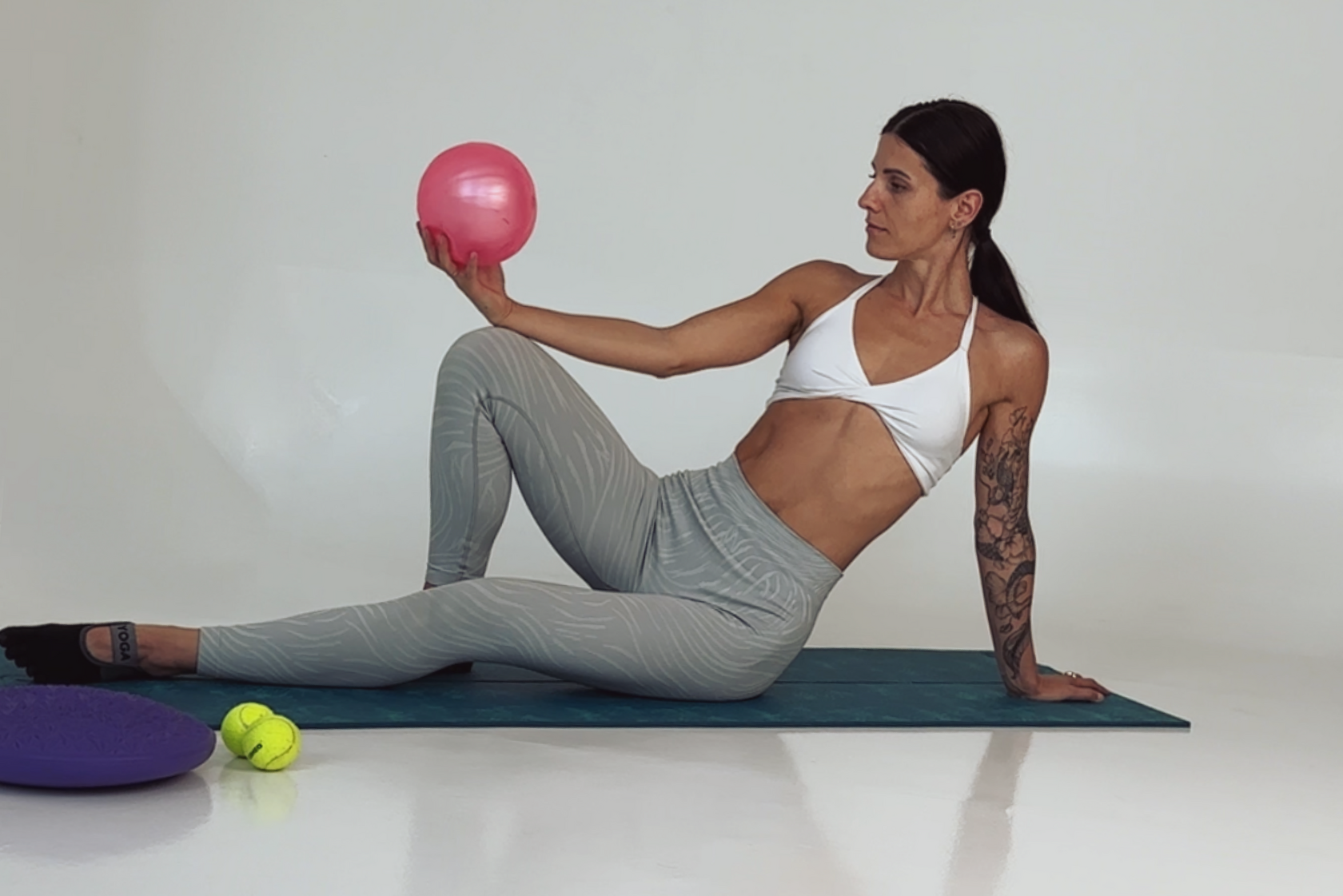 балансировочная подушка, рол для мфр, массажные или теннисные мячики 8см (2шт), лента для пилатеса, мяч для пилатеса 25см.